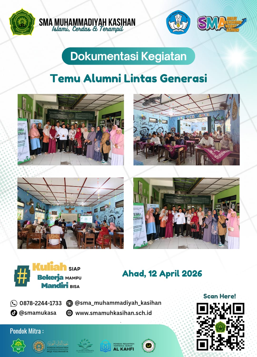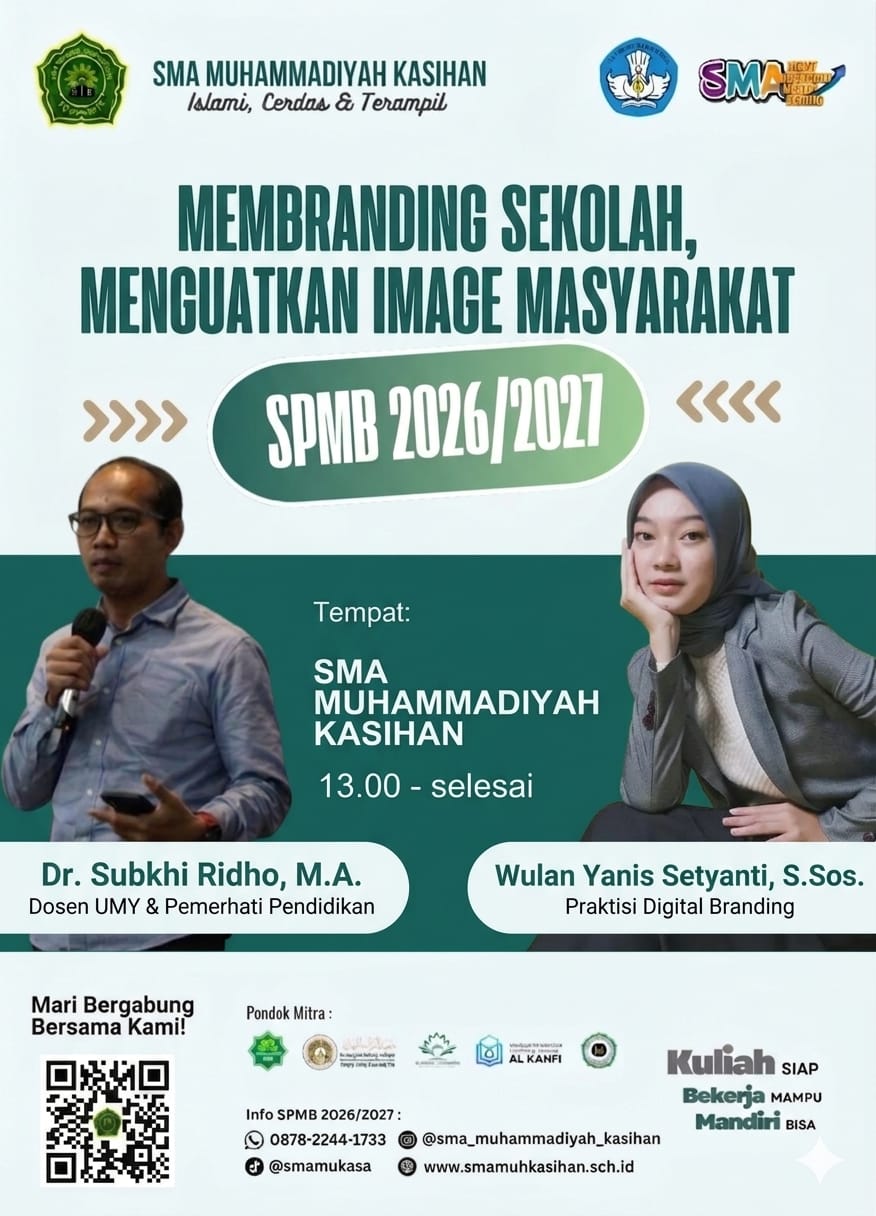 Assalamualaikum Wr. Wb.Pada era revolusi 4.0 dan pesatnya perkembangan teknologi informasi dan komunikasi sekarang ini, tidak dipungkiri bahwa keberadaan sebuah website untuk suatu sekolah, termasuk SMA Muhammadiyah Kasihan sangatlah penting. Website ini dimaksudkan sebagai sarana untuk menginformasikan berbagai kegiatan sekolah yang bisa diketahui oleh masyarakat luas. Disamping itu, masyarakat juga dapat mengetahui profil, visi misi, data guru dan tenaga kependidikan, prestasi sekolah baik peserta didik maupun guru dan tenaga kependidikan, kegiatan ekstra kurikuler, sarana dan prasarana, penerimaan murid baru (SPMB) serta informasi lainnya dari SMA Muhammadiyah Kasihan.Disamping